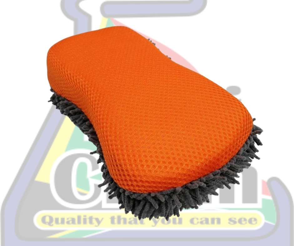 A very useful, double-sided carwash sponge. One side has thin microfibre strands used for scrubbing and washing and the other side has a tight-pulled cloth surface used for wiping and polishing.