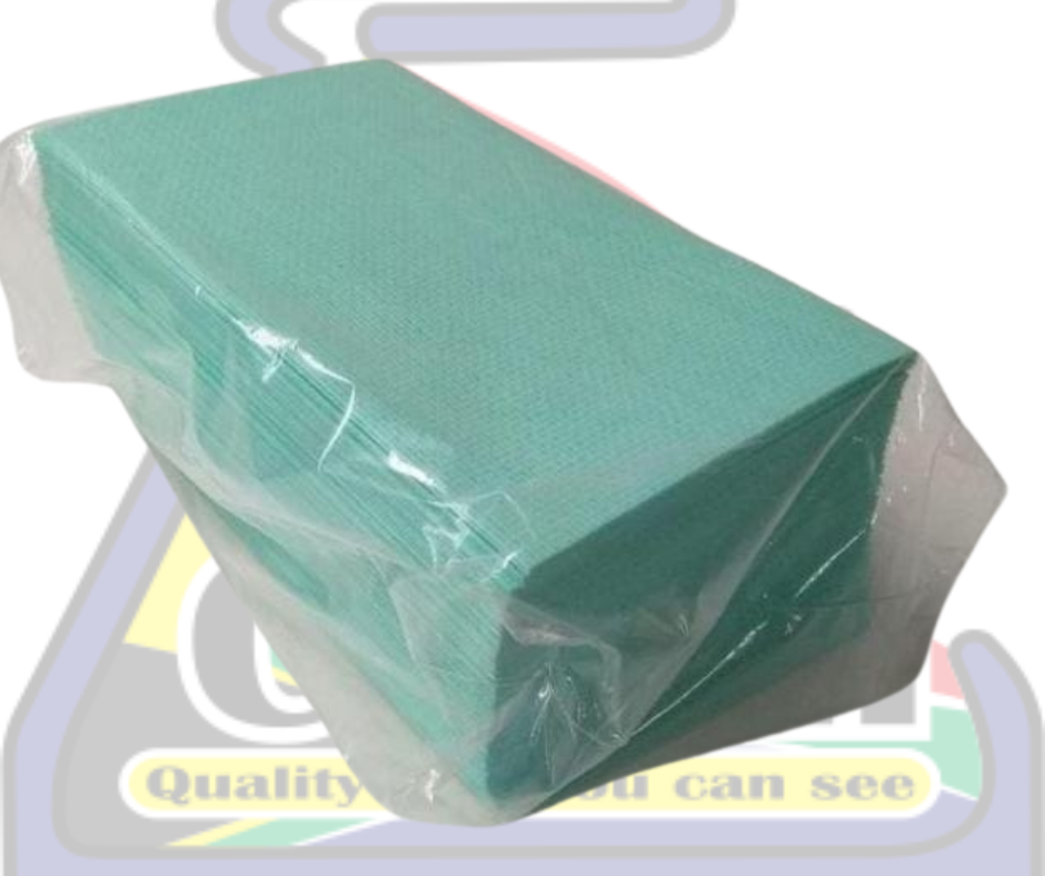 A pack of 50 Blue, Green or Pink, general purpose spunlace cloths. This cloth is a disposable cloth that is used on different surfaces such as counter tops. This cloth can also be used to wash dishes. The cloth size of the cloth is 38cm x 30cm.
